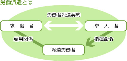 労働派遣とは、派遣元が雇用する労働者を派遣先に派遣し、派遣先の指揮命令を受けて労働に従事させることをいいます。派遣先との間で雇用契約はありません。